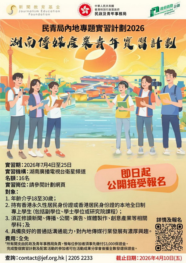 1. 計劃概況 本計劃由香港特別行政區政府民政及青年事務局與新聞教育基金合作舉辦,旨在為香港青年提供一個以傳媒專業為主題的深度實戰實習機會他們直接加入湖南衛視的核心部門,進行為期三週的沉浸式實習。透過參與真實的節目製作、新媒體運營及品牌宣傳等工作,讓在港修讀傳理及相關學科的大專學生,不僅能深入了解內地頂尖媒體的運作環境、行業生態及前沿趨勢,更能將專業理論應用於實踐,累積寶貴的實戰經驗與作品。